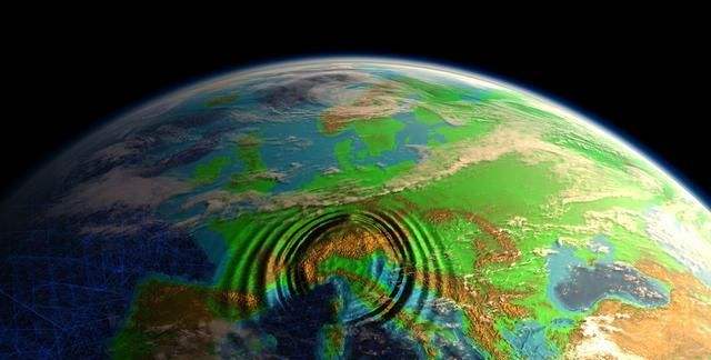 畫面為震源到地表的剖面圖,模擬地震波從震源到地表的傳遞的過程,紅色代表縱波、綠色代表橫波;根據橫波和縱波的傳播速度和時間差可以確定地震的震源距地表建筑的距離。