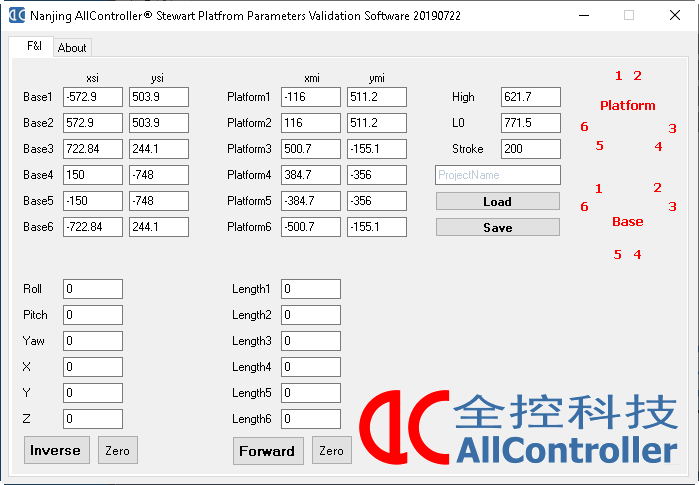 l 輸入相應的位姿或電缸伸長量數(shù)值后,點擊Inverse或Forward進行反解和正解運算。